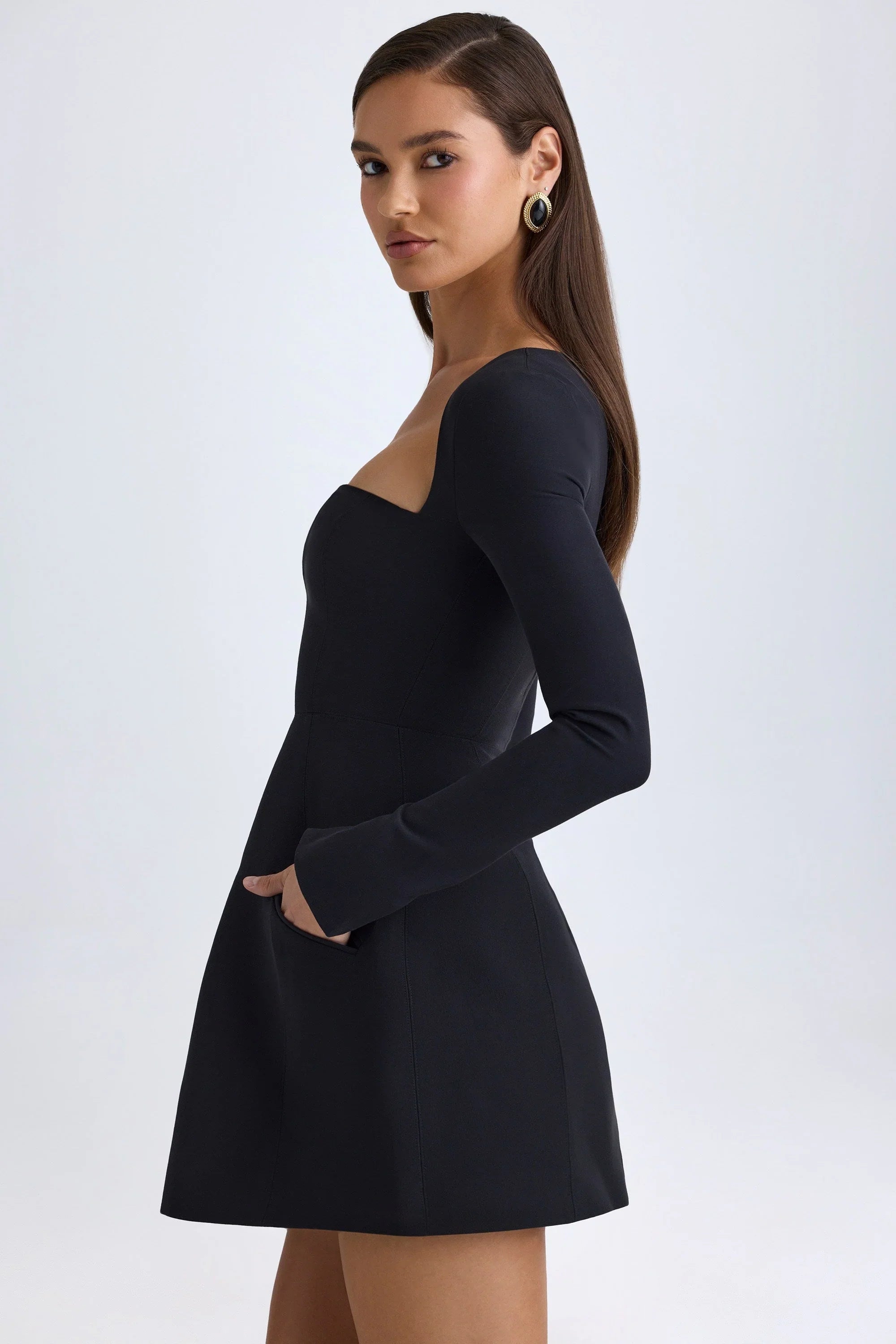 Classic structure. Your new favourite for dressed-up dinner dates and evening plans, the Taesha mini dress is crafted from premium stretch-woven fabric to a structured silhouette with a figure-defining bodice and exaggerated tulip skirt that accentuates your shape. It’s complete with long flared sleeves and decorative slip pockets that speak to the timeless tailoring inspiration.